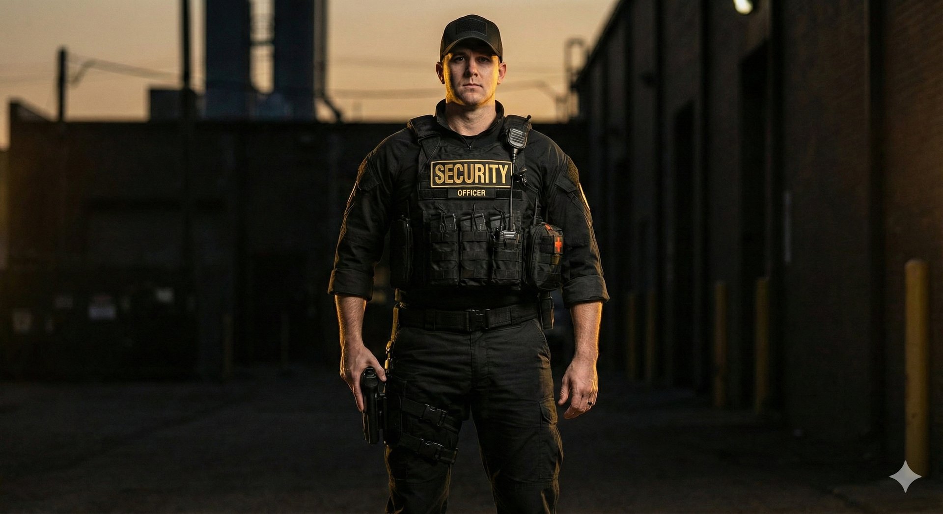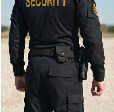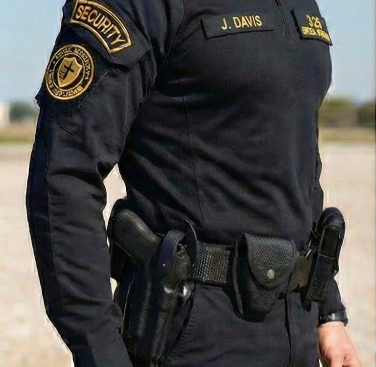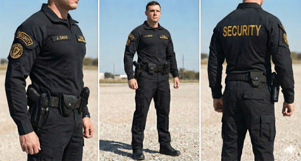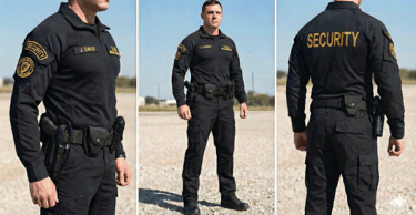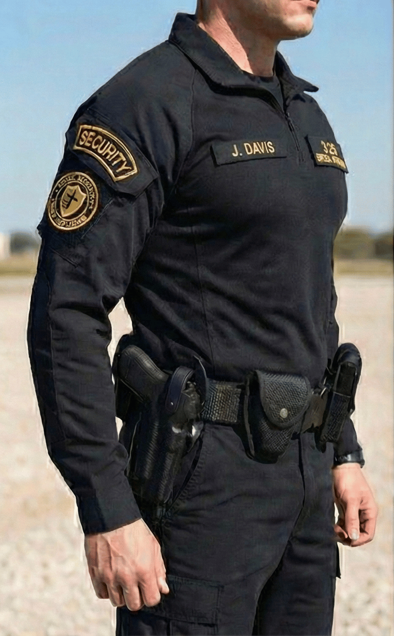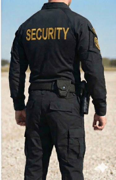 The Uniform: Officers wear a durable, solid black Tactical Utility Uniform consisting of tactical shirts paired with BDU-style pants. This style is built for performance and agility, ensuring officers are visually distinct and ready for immediate response in any situation.